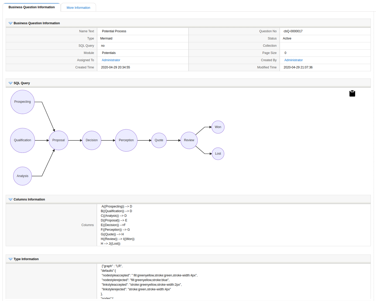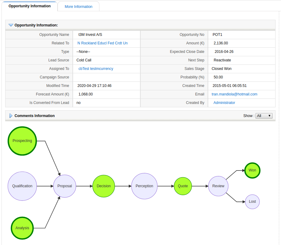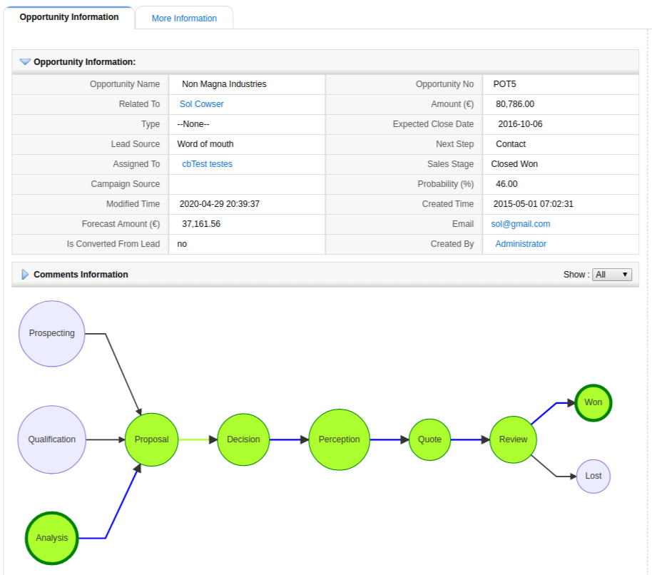 The idea is that we can have a process established in a module. This process is related to a field in the module that passes through some states. For example, the sales stage picklist in Potentials. As the opportunity is worked on, the different sales stage states are selected. At any given point in the life of the opportunity, we can load a mermaid graph that will ask ModTracker which have been the changes that the record (the sales stage field) has gone through, and for each one, we will be able to apply a style.