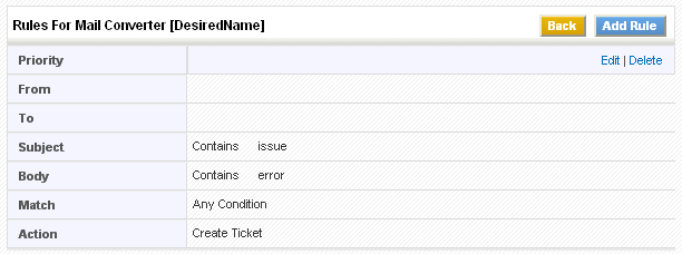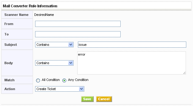 Example: Rule to create trouble ticket from any email is shown below: