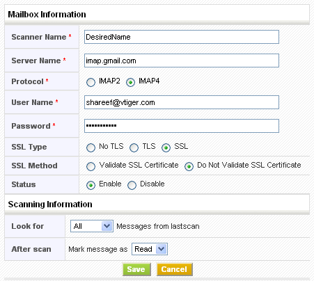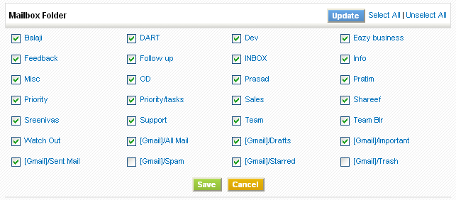 Provide configuration details to establish connection with your mail server and click on the Save button; As a result, all the available folder names will be fetched. If the connection fails the information will not be saved.