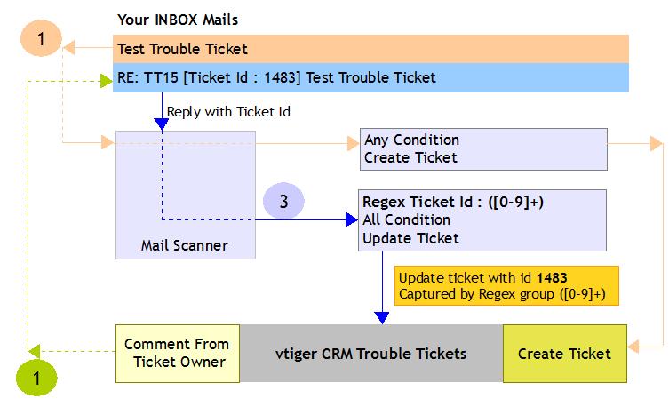 Lookup is made on existing trouble ticket based on FROM field of email and title or CRMID match. Preferable to select Regex as Subject and paste the following code in the text area