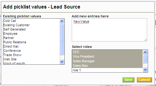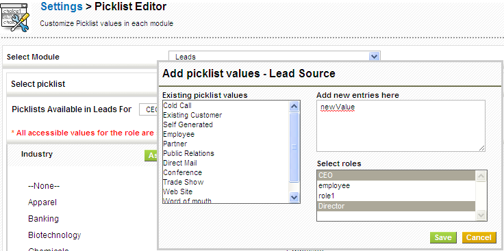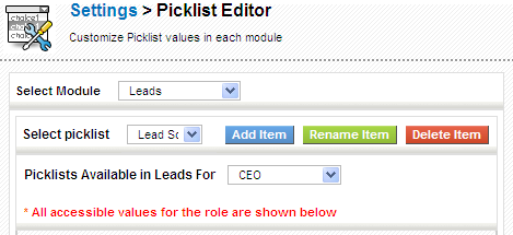 Picklist Editor can be used to customize the picklist values in different modules. Select a role before performing global actions such as add, edit and, delete; as the picklist values vary across roles.
