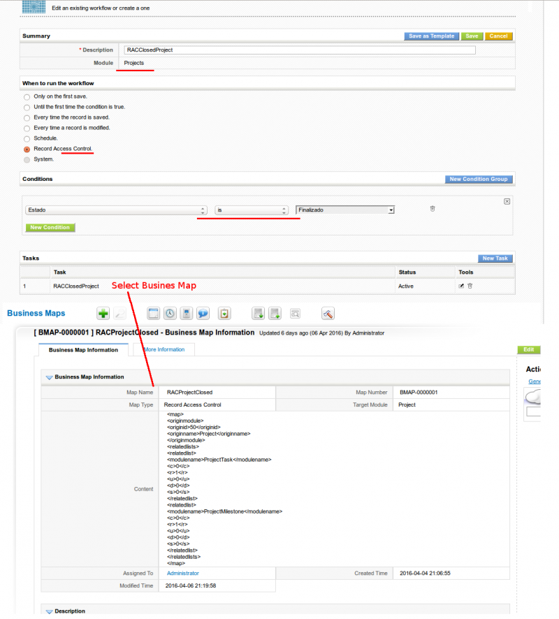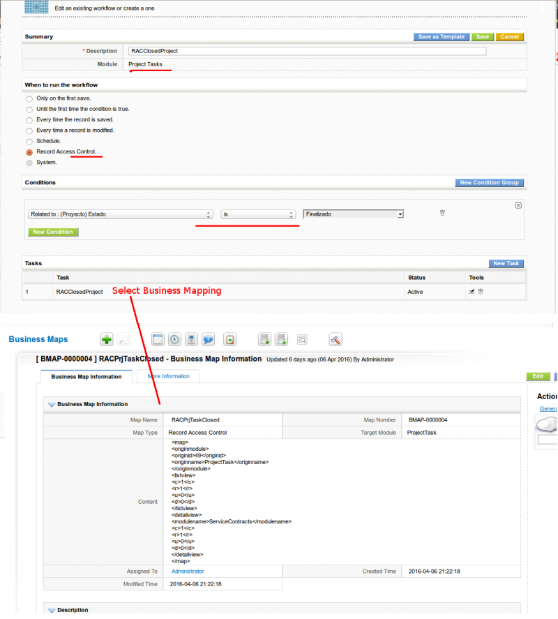 For example, we can easily block editing and deleting of a project task depending on the status of it's parent project. That would look like this. First a workflow and business mapping to block the projects that are closed: