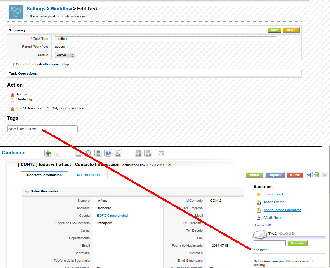 This workflow task permits you to add or delete tags on the object being saved. Either associated to the current user doing the operation or massively to all users.