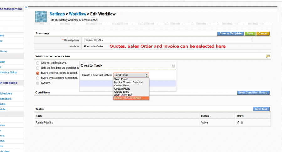 This workflow is associated to Quotes, Sales Orders, Invoices and Purchase Orders and permits the automatic relation of the products and services on each of these modules with the Account, Vendor and/or Contact selected on the record.