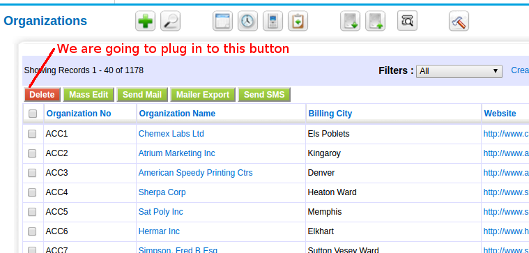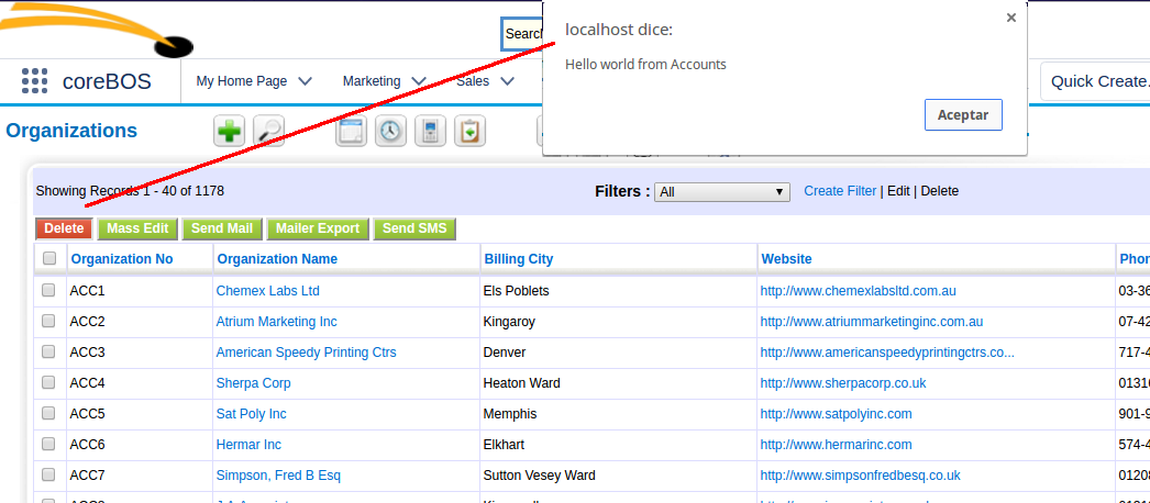 First we need a place where we can load our own JavaScript code, this is done using the coreBOS PHP action links as explained in the How to add action links to a module development tutorial and looks like this:
