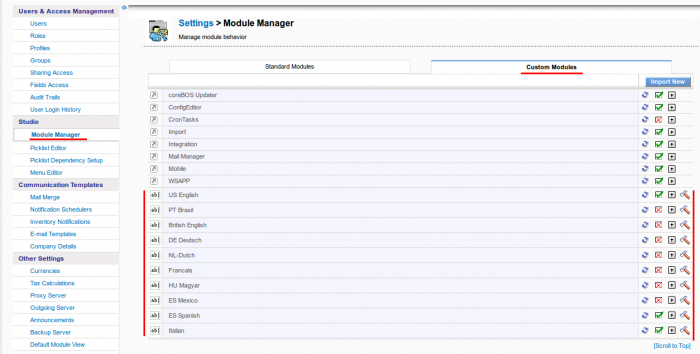 To access the translator you must login as an admin user and go to the Module Manager. On the Custom Modules tab we will find the language files and next to each one the hammer icon will take us to the translation screen.