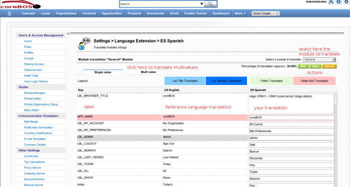 Thanks to the team at OpenCubed who have modified an abandoned project of many years ago, starting at coreBOS 5.6, we have the functionality to translate the labels from within the application.