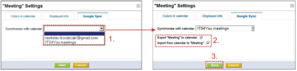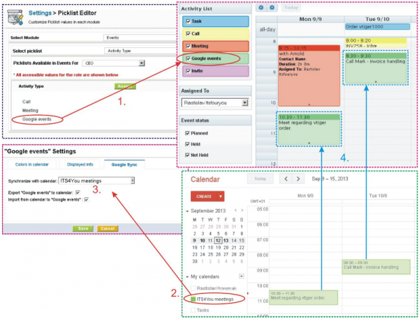 In the image below you can see a simple example of synchronization with Google via separate activity "Google events". These are the steps: