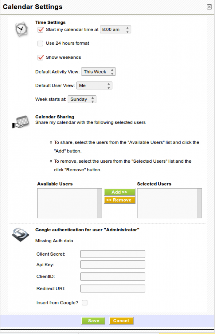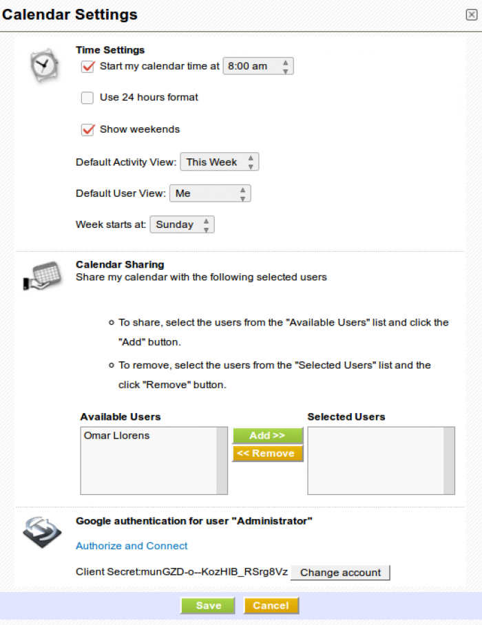 Due to Google Security issues, integration does not require user's email password anymore. So you just have to configure the parameters above and validate the admin user, the rest of users, just need to click on the Authorize and Connect link to give permission to the admin user to manage and share their calendars.