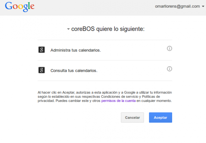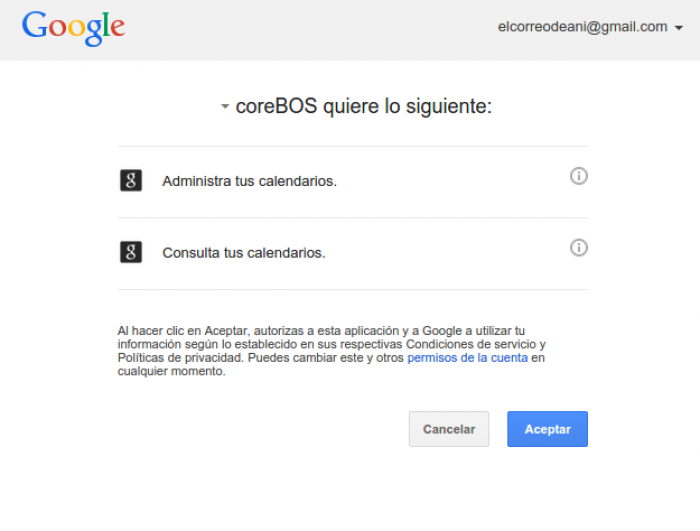 and you can see that you can clic in a new link called Authorize and Connect , for permit coreBOS to manage your calendars. Now this Authorization is for the actual google user that you have connect in your browser. If you disconnect, you will can to choose an other user to give this authorization