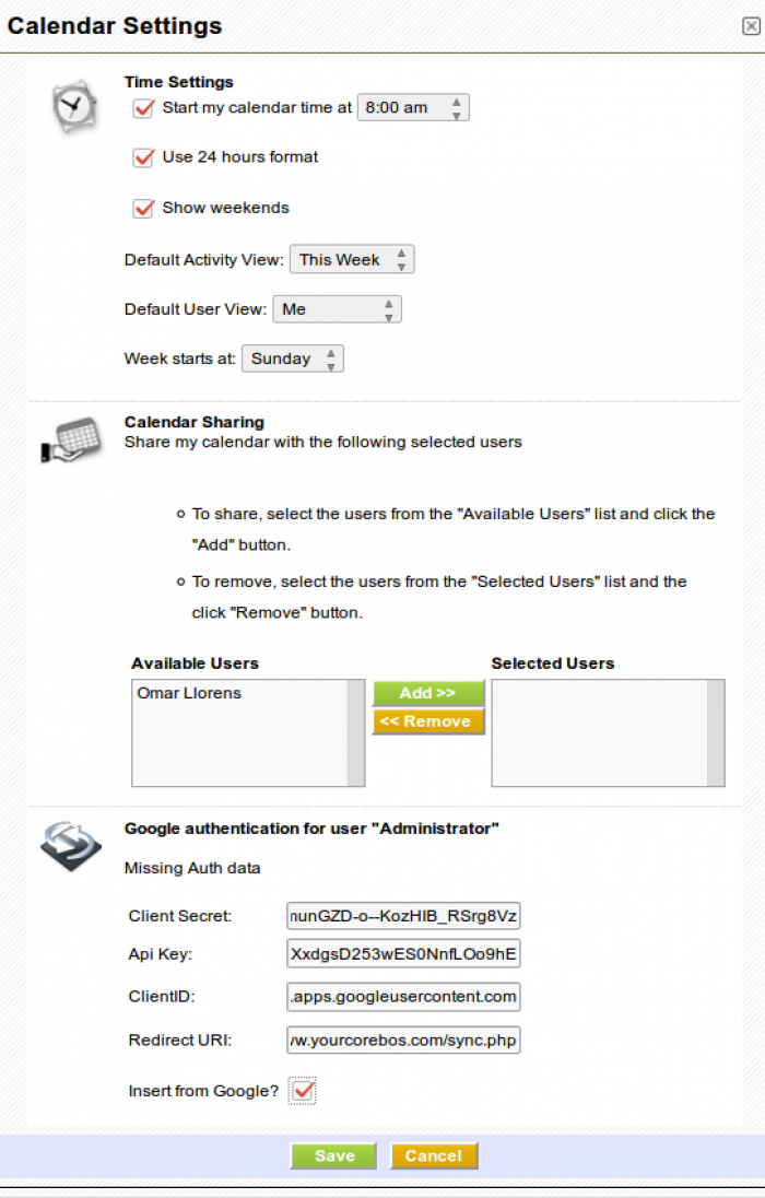 You can view or synchronize your Google events with your coreBOS events using the Calendar. Firstly you have to set up your Googleaccount/credentials.