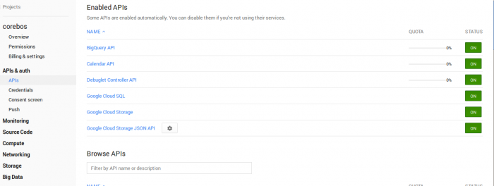 3.- Go to the Project. Click API in APIs&auth section and activate the Calendar API