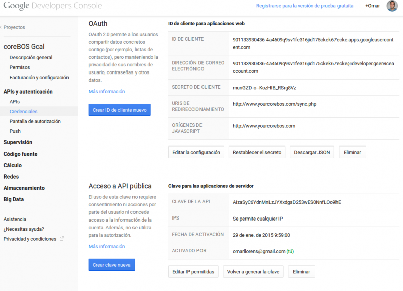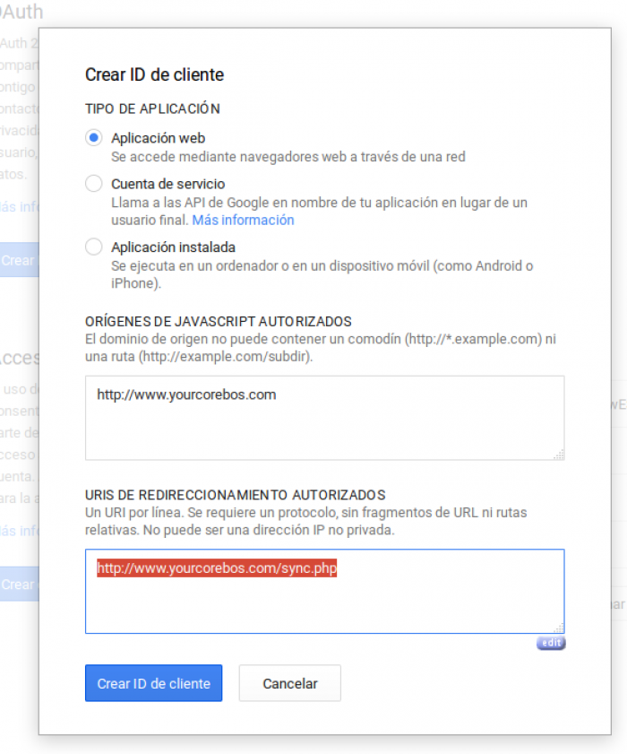 7.- Now you can finish to config the Client ID, here is important that you write the url to your coreBOS/sync.php in Redirect URI. For example: http://yourcorebos.com/sync,php.