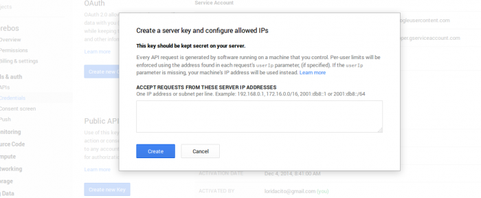 4.- Go to the Credentials section and create the Public API Key by clicking Create New Key. Choose Server Key