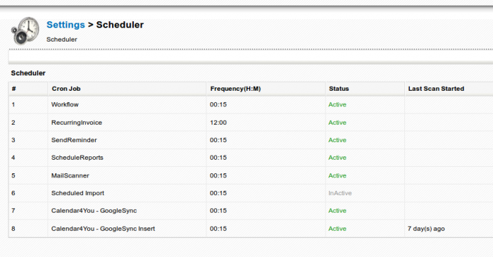 13.- Just an other thing. For active the Calendar4You Crons to sync the events with Google Calendar, you have to go to coreBOS Settings -> Scheduler the last two crons that you can see the next image.