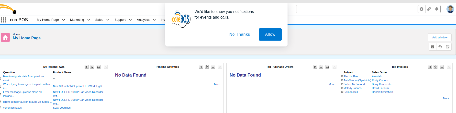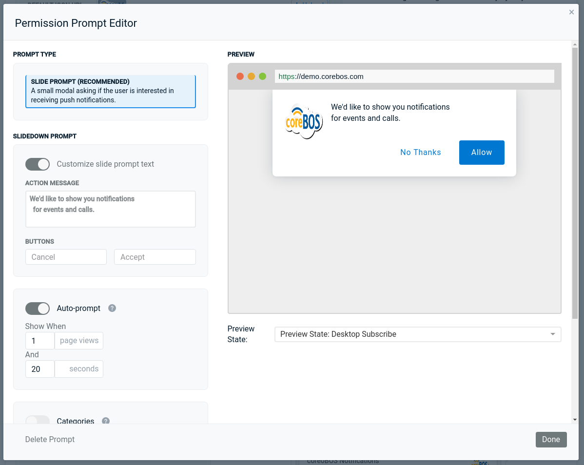 - Configure the initial permission prompt. All users MUST accept that we send them notifications. The first time a user access coreBOS with OneSignal active, the permission prompt will appear. If they do not accept that we send them notifications, we will not be able to do so.