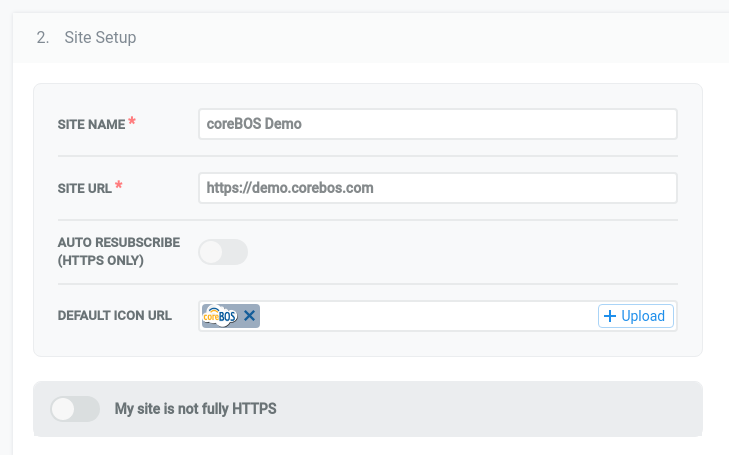 - Site URL: the URL of your coreBOS install (must be publically accessible)