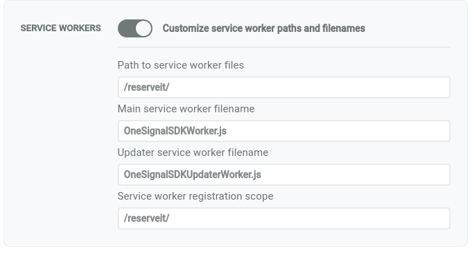 - The advanced options Service Workers settings may need modifications. If your coreBOS has its' own domain, which is the one you entered in Site URL above, then you can leave this option unchecked. If your coreBOS is installed in a subdirectory then you must check this option and set the name of the directory. Supposing that the coreBOS we are configuring is in a subdirectory named "reserveit", then our settings will look like this: