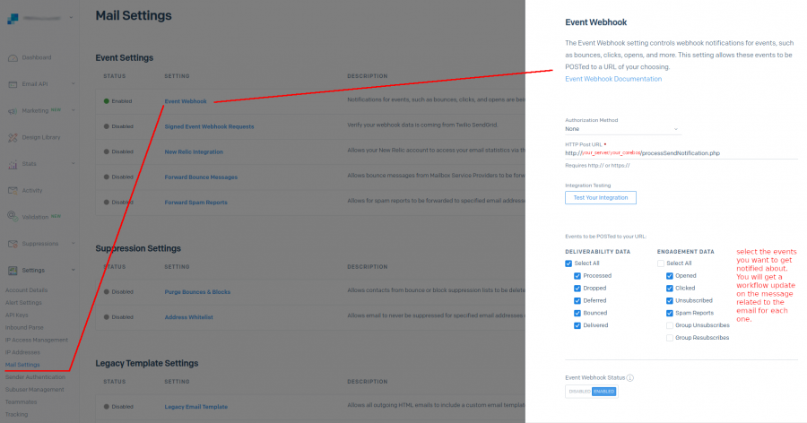 In SendGrid Dashboard we go to Settings > Mail Settings > Event Webhook. Put in the Post URL the URL to your coreBOS install, like this: