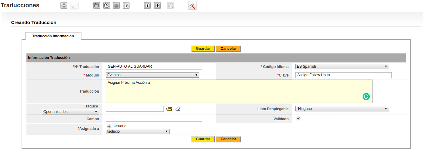 Go to the coreBOS Translation module and create any translation records you may need. That will look something like this: