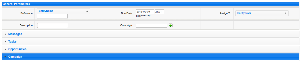 The general parameters define the reference text, date, campaign and user assigned to the new entities we will be creating in each process section. For example, in the first Message section we will be able to select an email template and massively send emails to all the selected contacts. In the Tasks section, we would be able to program calls or visits for the contacts and assign them a date and salesperson as well as there initial status. We can also create business opportunities to do the follow up of the campaigns and link back into standard vtiger CRM features through the Opportunity module. Finally, the last section will permit us to accomplish one of the most demanded features in vtiger CRM forums: massively link many contacts who have been filtered based on conditions from the account to a campaign.