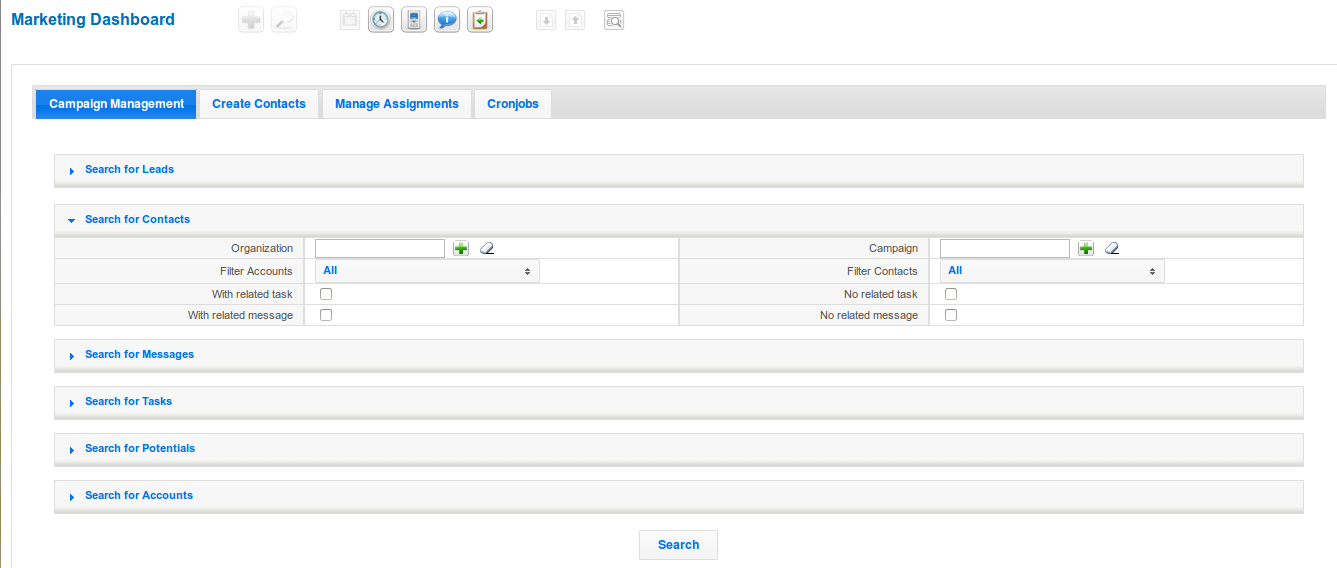 vtMarketing Dashboard is a bundle of three vtiger CRM modules and an advanced search and process extension which comes to fill the gap that is missing between the campaign and the contacts.