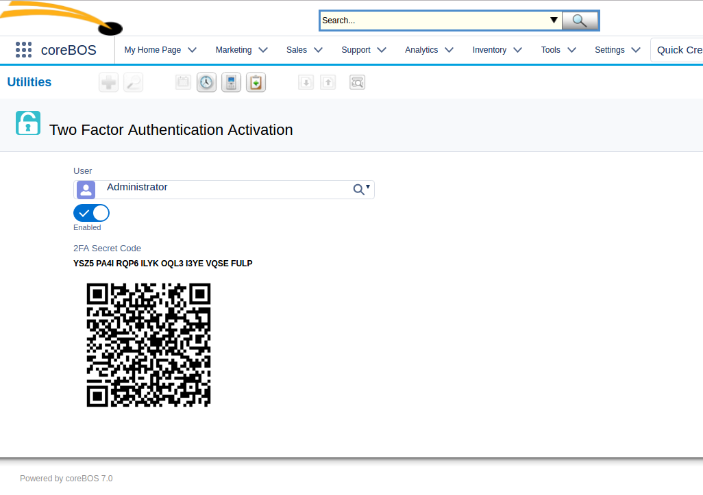 MOBILE expects you to have installed the Google Authenticator App on your mobile device. Then go to your users' profile and click on the "Two Factor Activation" button. This will take you to a screen where you can activate this functionality. Once activated you will see your secret code, both as a number and as a QRCode that can be scanned into the App.
