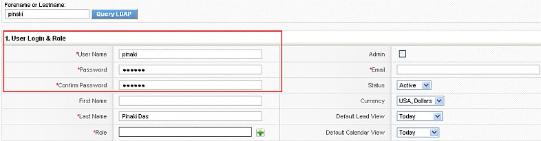 Fill up any missing mandatory fields and click on the save button to create the user. Once created, you can log in using the username and LDAP password. The password for the user will be picked from LDAP which means that changes in LDAP password would reflect in the application without any changes.
