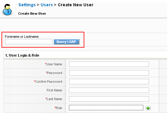 Enter the LDAP username you would like to query and click on the "Query LDAP" button. This will retrieve the users information from LDAP and automatically fill up the user fields.