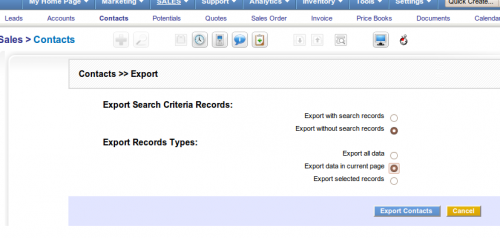 First I need a CSV file prepared to import into coreBOS. I will do the example with contacts (any other importable coreBOS module works the same). To obtain the file I export information from coreBOS demo site. This is the image: