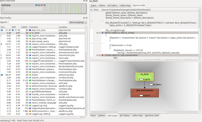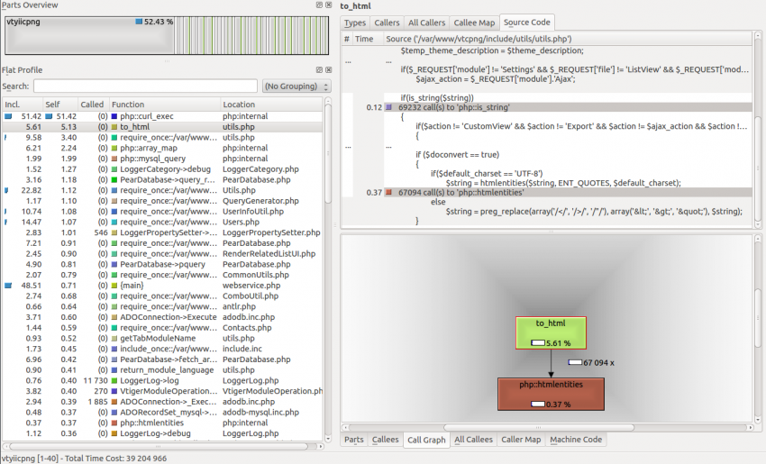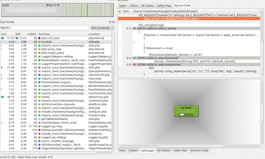My next step was to have a look at the to_html() function inside coreBOS as it was next on the profile list. As can be seen by the profile, 69232 calls to is_string() which consume 0.11 seconds are made. There is little to be done here.