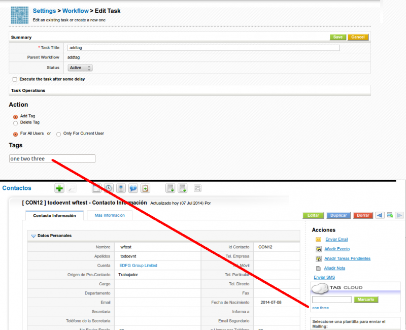 This workflow task permits you to add or delete tags on the object being saved. Either associated to the current user doing the operation or massively to all users.