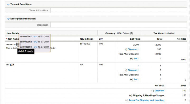 For the product lines, the idea is to be able to quickly see the assets related to the product line sale and create new assets for that line. Hovering over the icon will show a list of related assets and clicking on the icon will take us to the asset creation screen filling in as much information as it can from the invoice.