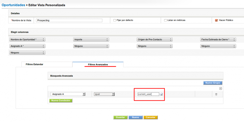 To accomplish this we can use a special meta-variable when defining our filters for the user fields. This field is called "current_user" as can be seen in the next image.